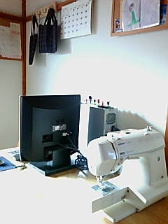 ひとつのテーブルの上に、パソコンとミシンがのってます