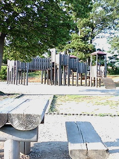 画像の中にある竪穴式住居みたいな遊具。(近くでみるととっても大きい遊具です)
