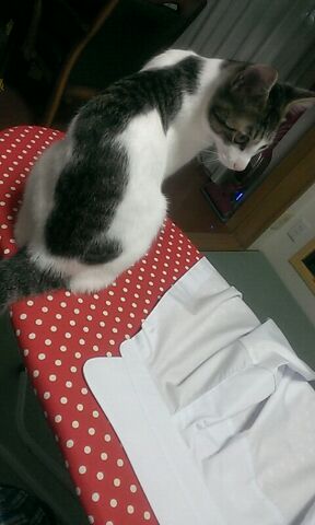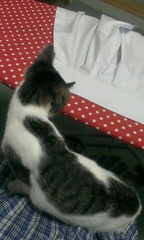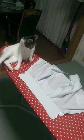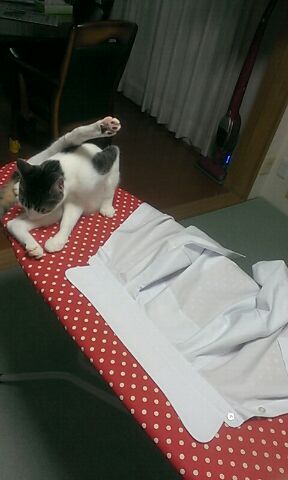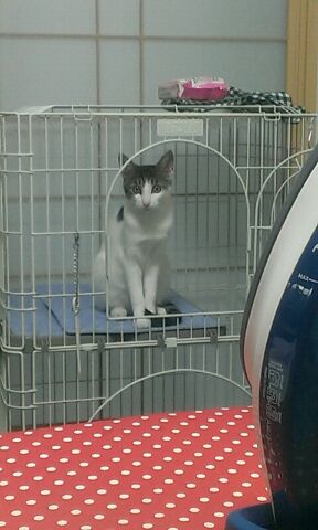 フクちゃんのケージの真正面でアイロンを掛けていると