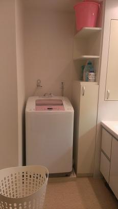 ごく普通の縦型の洗濯機と洗濯カゴと